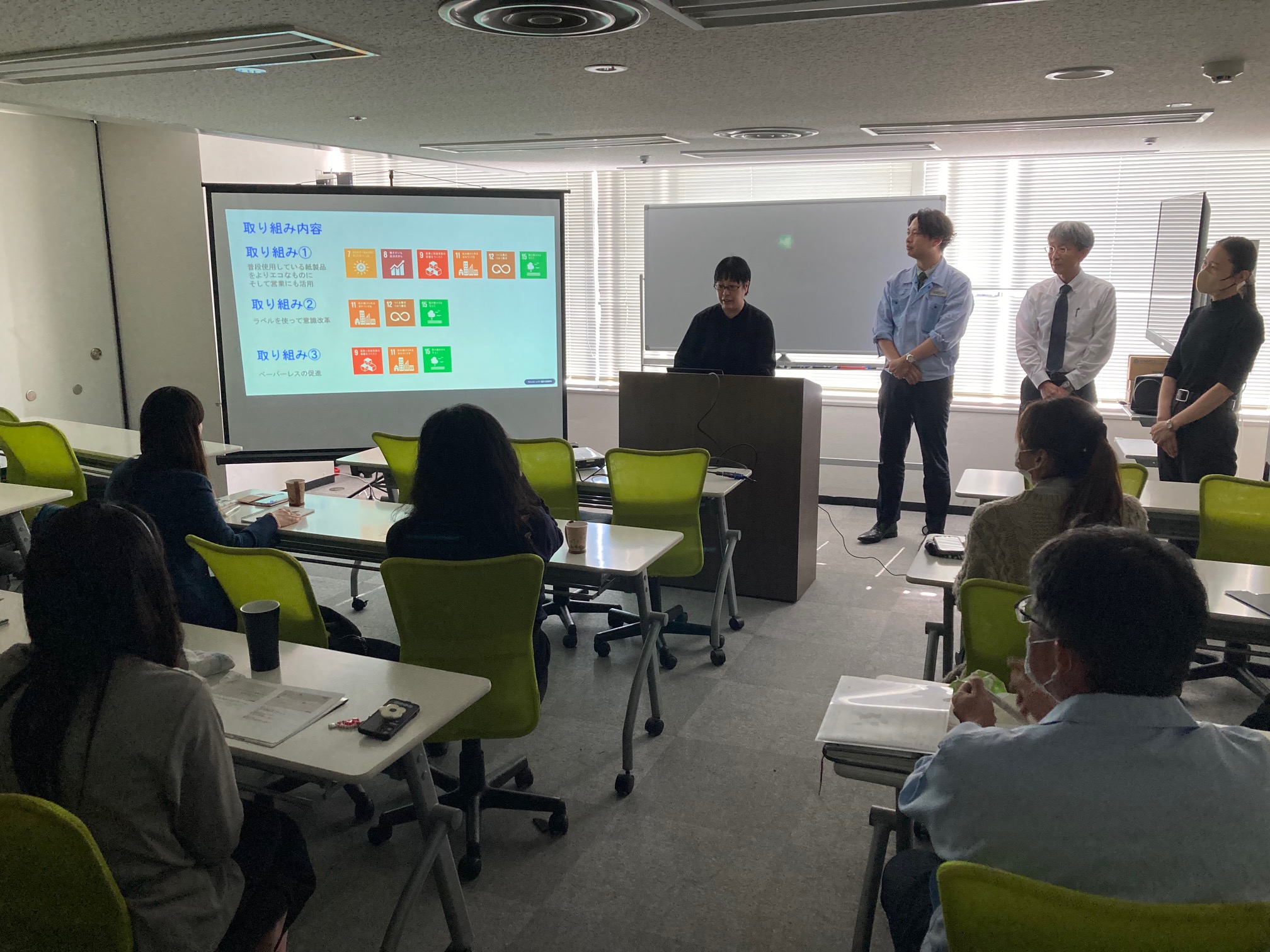 11月7日(金)12:00~13:30 4年ぶりに新たなメンバー組合せによる3~4人一組の4チームに分かれて、「パートナーシップで目標を達成しよう」「住み続けられるまちづくりを」「つくる責任使う責任」「エネルギーをみんなに そしてクリーンに」「産業と技術革新の基礎をつくろう」「陸の豊かさも守ろう」「すべての人に健康と福祉を」をテーマに、調べた課題や問題点、他社の取組み事例、当社が今後に取り組む活動の提案等を発表しました。